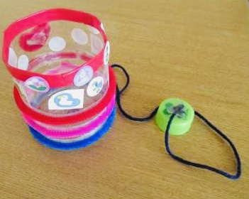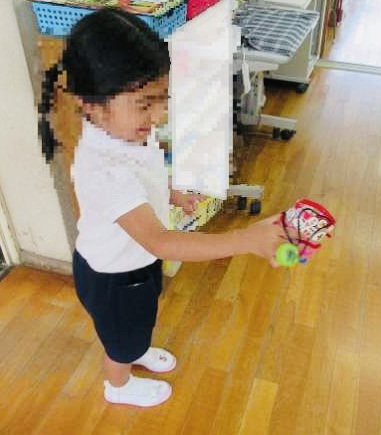 預かり保育に参加している子どもが、「見て!」と元気いっぱいに職員室にやってきました。ペットボトルとキャップで、けん玉をつくったようです。