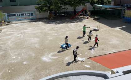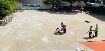 白いのがにがりです。園庭の土ぼこり、砂ぼこりを防ぐ効果があります。子どもたちが、快適に活動できるように、頑張っています。