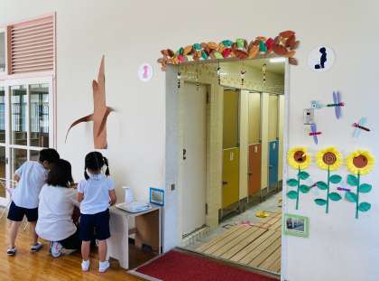 預かり保育の保育室横のトイレ入り口が、とてもかわいく飾り付けされていました。指導員さんと子どもたちで、つくったそうです。