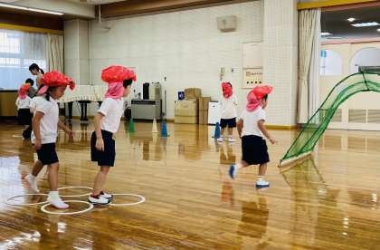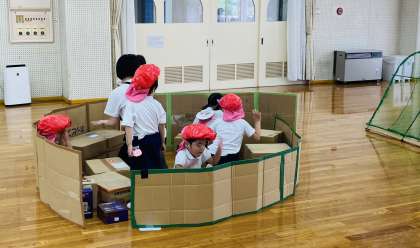 今日は、4歳児の子どもたちが、ザリガニになって、存分に遊びました。教師は、1学期から飼育しているザリガニからイメージを膨らませ遊びにつなげられるように、ザリガニ帽子やトンネル、隠れ場所など遊びたくなるものを考え事前に準備をしたり、遊びがさらに楽しくなるような認めの言葉をかけたり、友達の動きを知らせたりしていました。