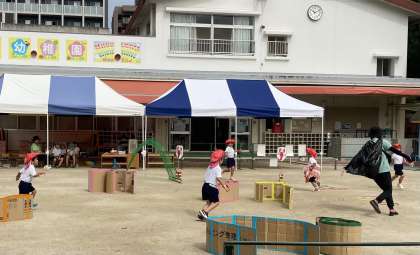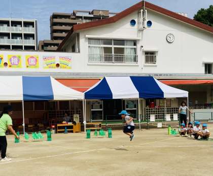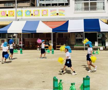 田川幼稚園の予行は、子どもたちが運動会のプログラムの順番で、いつも楽しんでいる演技や競技を他学年と見合うを運動会ごっこです。今日は、プログラムの前半を行いました。