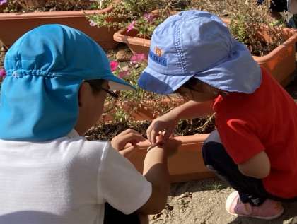 5歳児が、優しくダンゴムシを見せてあげる姿も見られました。