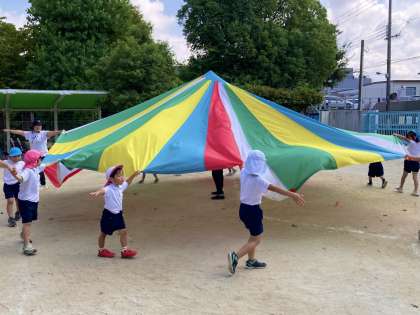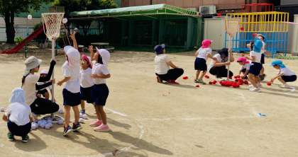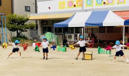 田川幼稚園の予行は、子どもたちが運動会のプログラムの順番で、いつも楽しんでいる演技や競技を他学年と見合ったり一緒にやってみたりする運動会ごっこです。今日は、プログラムの後半を行いました。