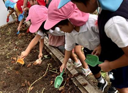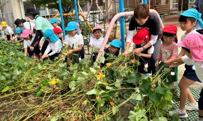子どもたちが春にサツマイモの苗を植えて、育ててきました。今日は、みんなで芋掘りをしました。