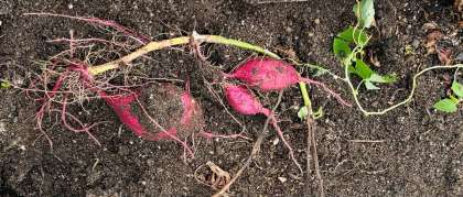 たくさんのツルをみんなで引っ張った後、土を掘るとサツマイモが出てきて大喜びでした。