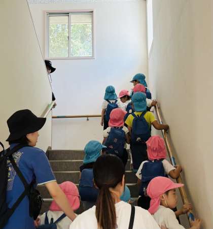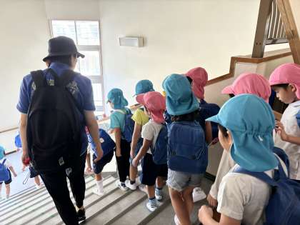 どんなところに気をつけたらいいかを子どもたちと一緒に考えながら、異年齢ペアで並んで歩いたり、階段の登り降りをしたりしました。5歳児が4歳児を気にかける姿がたくさん見られました。来週が楽しみですね。