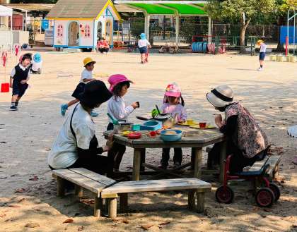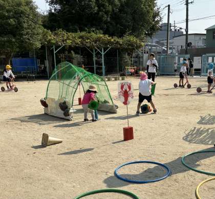 外で遊ぶのが心地よい季節になりました。園児も遊びに来てくれた小さいお友達も、やりたい遊びを見つけて存分に遊んでいました。