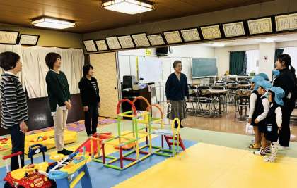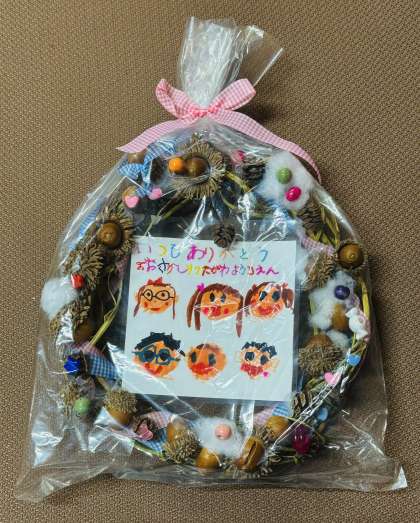 コロナ後、初めて5歳児が福祉会館に行きました。今日は、幼稚園の園庭で育てたサツマイモのツルを乾かして、5歳児が飾りをつけたリースをお届けしました。にこにこ顔で受け取ってもらい大喜びの子どもたちでした。