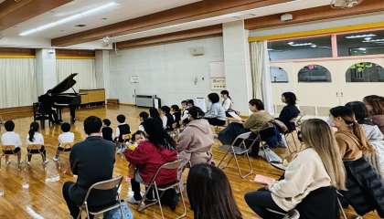 幼稚園のプレイルームで、いつも子どもたちの歌唱指導をしてくださっている音楽家の方による、クラッシックの親子ピアノコンサートを行いました。