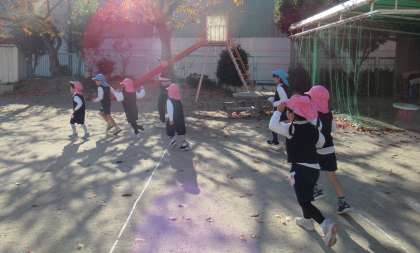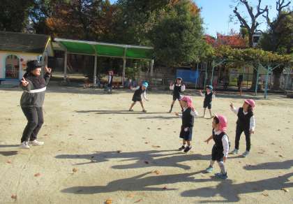 寒いときには、十分に体を動かして温まろう!と、5歳児と4歳児が一緒に体操をしたり、マラソンをしたりしました。