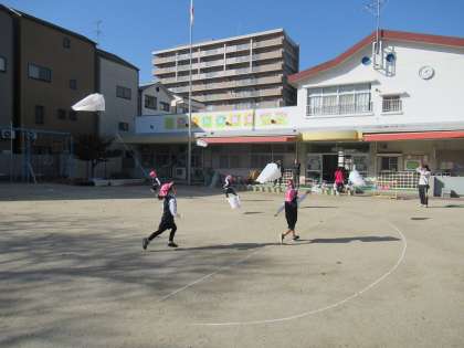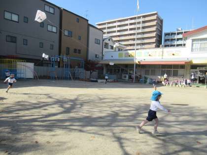 5歳児の凧があがるのを見て、4歳児は「すごい!」「高い!」と大喜び。4歳児もたくさんあげたいと張り切って走っていました。