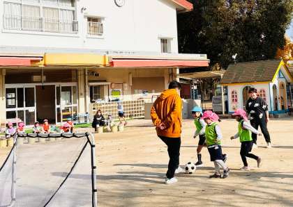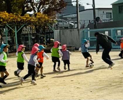 今日は、子どもも保護者も楽しみにしていた親子サッカーの日でした。サッカーのコーチに教わりながら、親子で一緒にボールを使った遊びをしたり、子ども対保護者でサッカーの試合をしたりしました。いっぱい走っていっぱい笑って、心地よい汗をかきました。