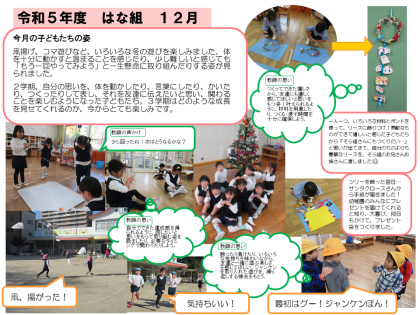 いろいろな経験を重ね、自分の思いをもったり、友達と思いを共有したりして遊ぶことを楽しむようになってきた子どもたちと、新しい年をどのように過ごそうか…教職員もとても楽しみにしています。元気いっぱいで、1月9日に会いましょうね。