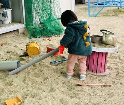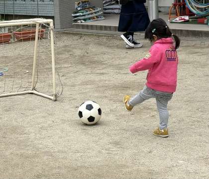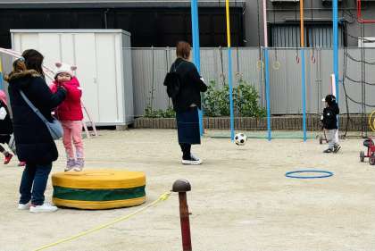 昨日は、ふれあい遊びデーがあり、小さいお友達が遊びに来てくれ、園児とふれあいました。前半は、広い園庭で好きな遊びを存分に楽しみました。ひとつの遊びを夢中で楽しむ子、いっぱい走って遊ぶ子、保護者と一緒にいろいろな遊びを試す子など、それぞれの楽しみ方をしていました。