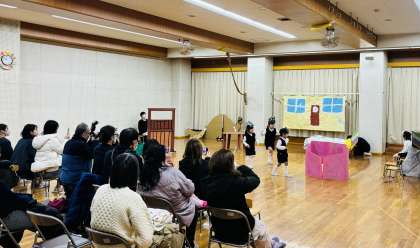 今日は、劇遊び、歌と楽器遊び、みんなで歌う歌、全部見てもらえるということで、とても楽しみにしていた子どもたち。朝からウキウキしていましたね。