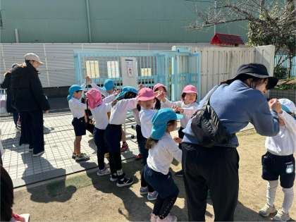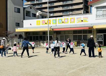 園庭は、ポカポカ陽気で外で遊ぶのが心地よかったです。園児たちも小さなお友達が来てくれて喜んでいました。