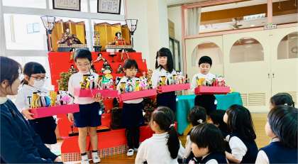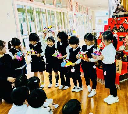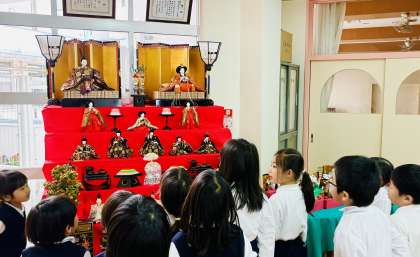 雛飾りの前に集まって、ひなまつりをしました。お雛様についての話を聞いたり、それぞれの学年がつくったおひなさまを見合ってたりしました。みんな元気に大きくなあれ。