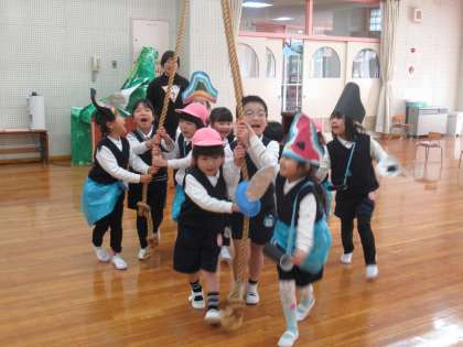 一緒に、ずっとあこがれていたそら組の劇遊びをしたり、気持ちを込めてつくったプレゼントを渡したり、『おわかれかいのうた』を歌ったり…。自分たちが考えたことを、伸び伸びと遊んだり、喜んだりするそら組の子どもたちの姿に、はな組の子どもたちも大盛り上がりでした!