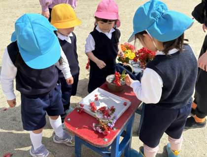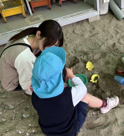 昨日入園した子どもたちも、今日は好きな遊びを見つけて楽しんでいました。進級児がやさしく関わる姿も見られました。
