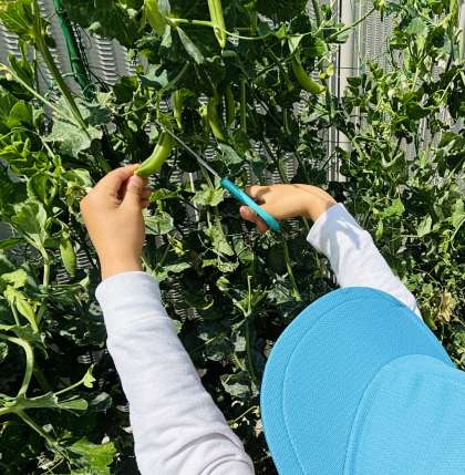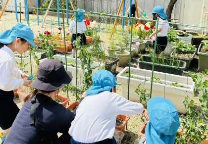 今日は、進級児がスナップエンドウの収穫をしました。美味しそうなのを自分で選んで、10個ずつ取って持ち帰っています。自分たちが水やりや雑草抜きをして大切に育てたものです。お子さんと一緒にお召し上がりください。