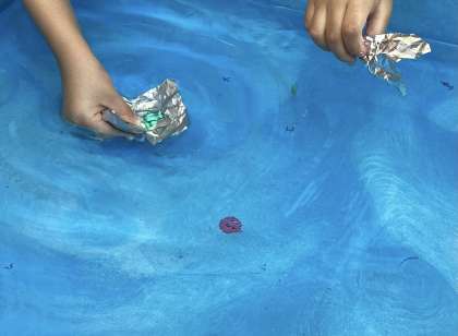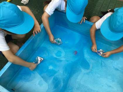 アルミホイルにホワイトボードマーカーで絵をかき、水にそっと入れると・・・かいた絵がユラユラ水に浮いていました。