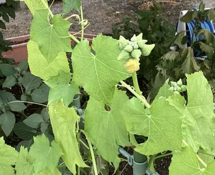園庭では、ヘチマがぐんぐんと生長し、花が咲く準備をしています。