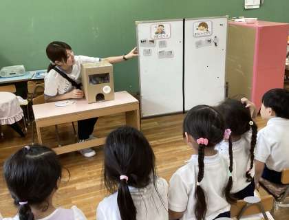 絵本を使った研修に全教職員で取り組んでいます。子どもたちが自分の思いをのびのびと表現できるように願い、保育をしました。