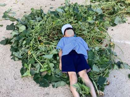 「お芋のツルのベットみたい」と言って、沢山のツルの上に寝そべって「ふわふわで冷たくて気持ちいい」と満足そうでした。