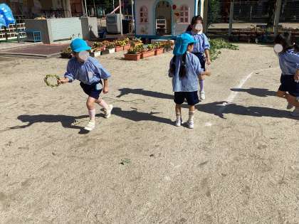 ツルをくるくる巻くと、「これでリレーできる!」とバトンの代わりにして、繰り返しみんなで走っていました。どんなものも、子どもたちの素敵な気付きから、楽しい遊びに変身です♡