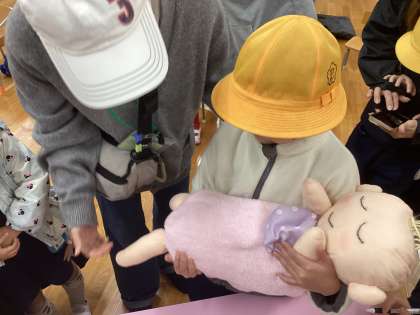3kgの赤ちゃんの人形を抱っこしてみたり、妊婦さんのお腹を触ったり、聴診器で音を聞いたりしました。子どもたちは「赤ちゃんはもっと軽いと思っていた」「音が聞こえる!」と口々に話していました。また、保護者の方も産まれた時のことを思い出しながら、子どもに話す姿が見られました。「生命」について考える時間となりました。