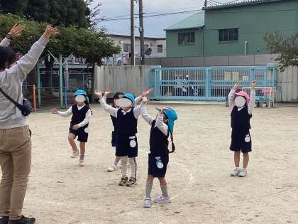 少しずつ肌寒くなってきました。今のうちに、しっかり体を動かして遊ぶことを楽しんで欲しいと思います。運動会後、どんどん活動的になってきた子どもたちと、今日は新しい体操をしました。体力がついてきた子どもたちは、最後まで笑顔で踊りきっていました。その後「(暑くなったから)ベスト脱ぐわ」と薄着になり、引き続き園庭で元気いっぱい遊びました。
