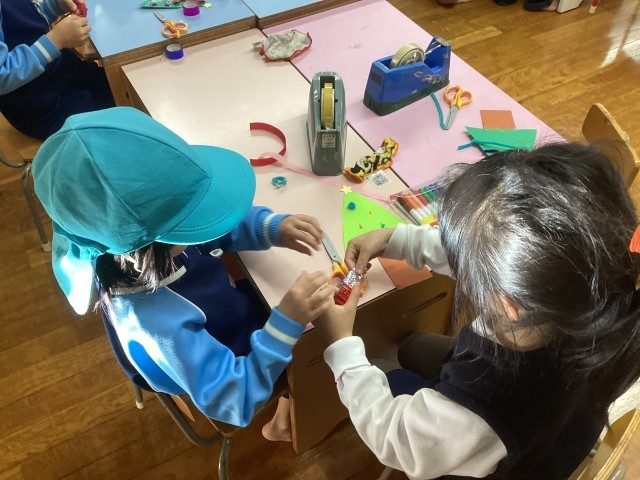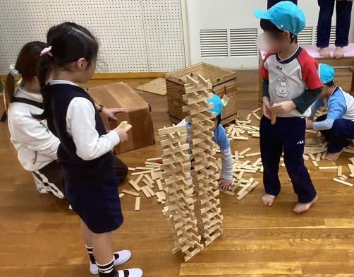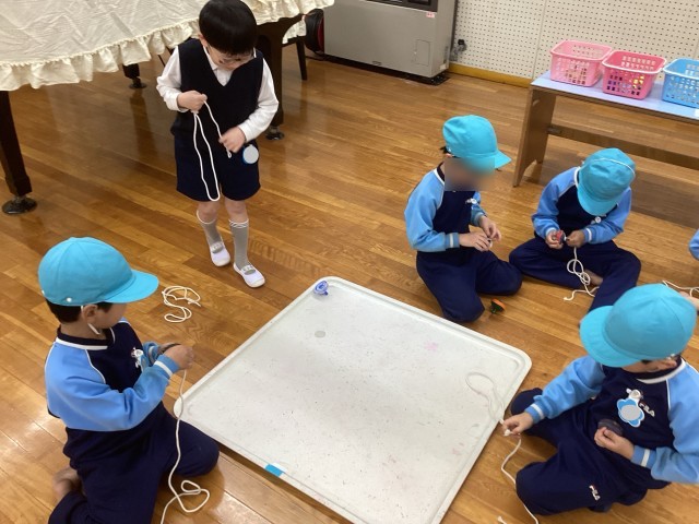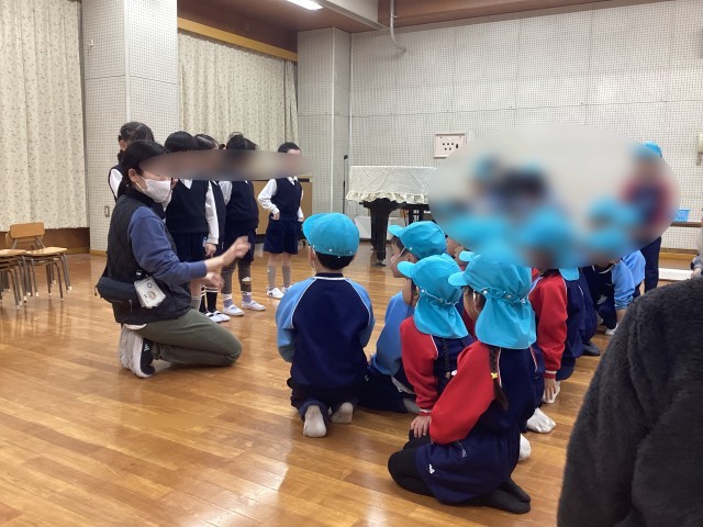 近隣園の5歳児ほし組さんが遊びに来てくれました。ほし組さんとの交流は今回で3回目です。お互いに名前を知ったり、「同じ小学校やな」と共通点を見つけたりして、親しみをもって関わっていました。いろいろな遊びの場で一緒に楽しむ姿が見られ、次の交流が待ち遠しくなりました。