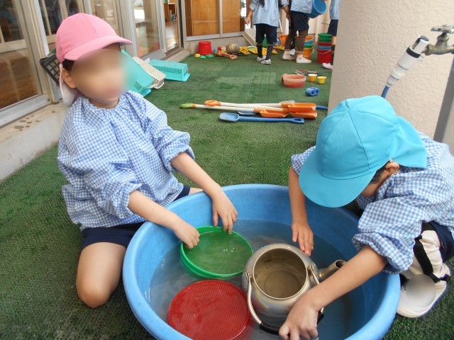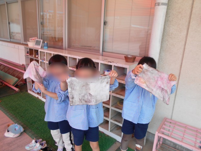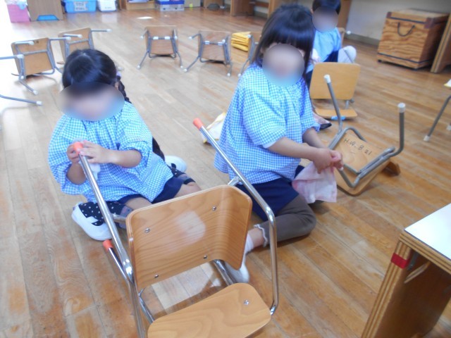 ゴシゴシと砂場遊具を洗ったり、ロッカーや椅子など日頃使っているものを拭いたりしました。