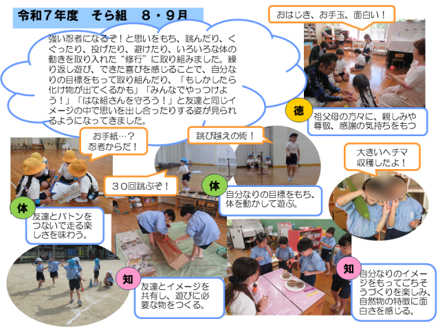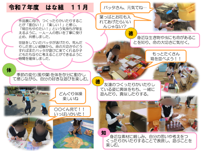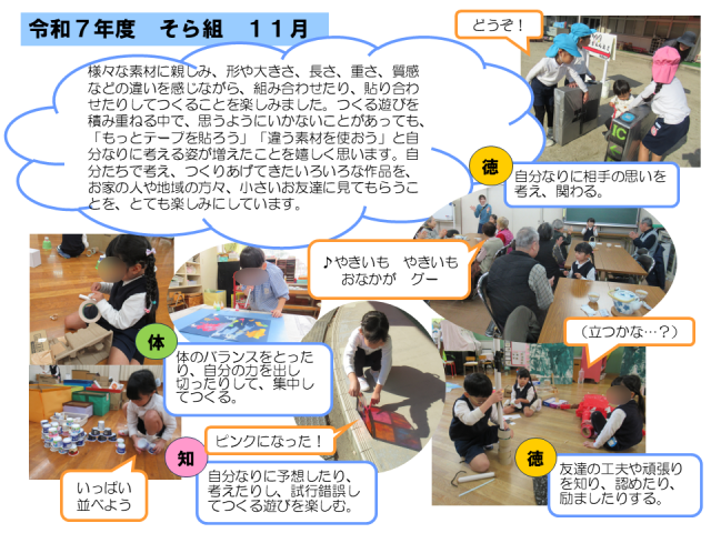 いろいろな経験を重ね、自分の思いをもったり、友達と思いを共有したりして遊ぶことを楽しむようになった子どもたち。
