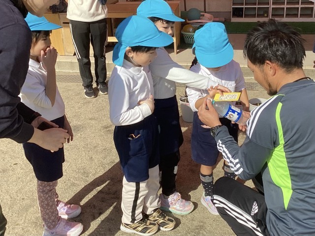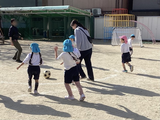 田川幼稚園の子どもたちから「おにぎりコーチ」と呼ばれているサッカーの先生がいます。今年は3回来てくれて、子どもたちがサッカーに親しめるよう、毎回、優しく楽しく関わってくれています。