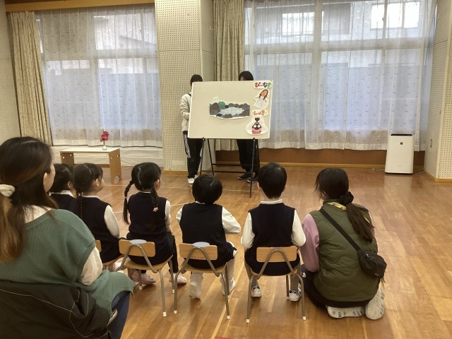 先生たちからのお話のプレゼントでは、言葉の響きに興味をもって、自分たちでも口ずさんでみる姿がありました。「この絵本、知ってる」「シリーズがいろいろある」と、これまでに親しんできた絵本のことを思い出して、伝えてくれていました。
