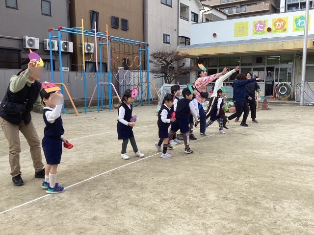 鬼のお面をつくって、「鬼は外!!」とみんなで豆をまきました。風邪バイ菌も幼稚園には来ず、みんなで元気に明日を迎えられそうです。