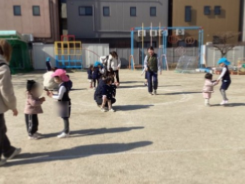 広い園庭でたっぷり遊んだ後、最後はみんなで手と手を重ね、一緒にダンスをしました。