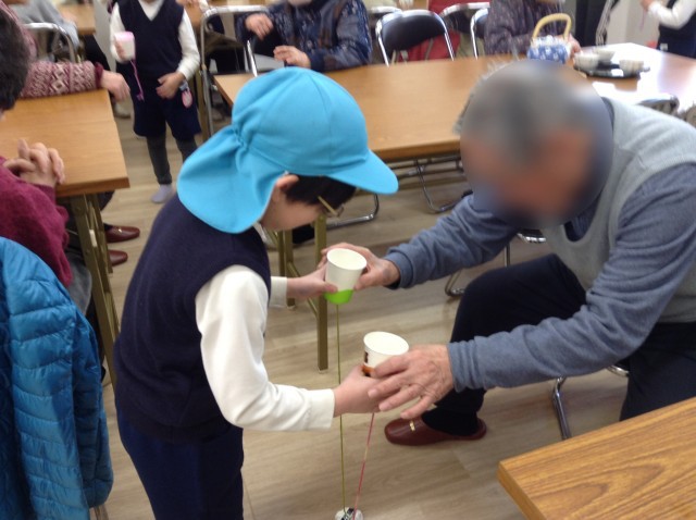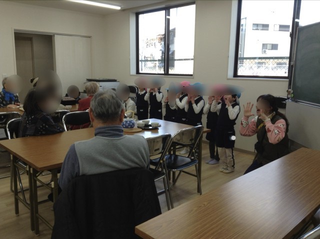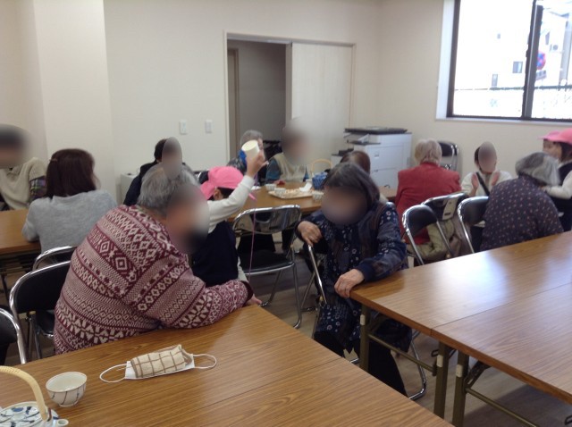 中には、食事会が終わって子どもたちの登場を心待ちにしてくれていた地域の方が沢山いました。早速、子どもたちは元気な声を届けたり、自慢のけん玉を披露したりしていました。帰るときには、「寂しいわ」と声をかけていただき、4歳児はまた来ることを約束して帰りました。とっても嬉しそうな子どもたちでした。