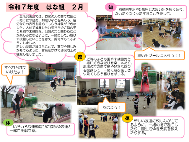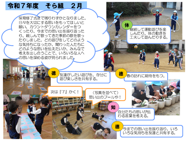 2月の子どもたちの姿です。 公開日 2026/03/04 更新日 2026/03/04 幼稚園日記 生活発表会でたくさんの温かい拍手をいただき、みんなで考え進めてきた遊びや継続して取り組んできた遊びを披露する満足感を味わっていました。こま回しや縄跳び、かるたなど、今も遊びが続き、友達と遊びの楽しさを共有したり、少し難しいことに挑戦しようとしたりする姿が見られています。3学期も残りわずかとなりました。進学・進級に向けて期待が膨らむよう、1日1日を大切に過ごしたいです。 いいね(0)