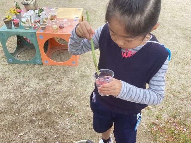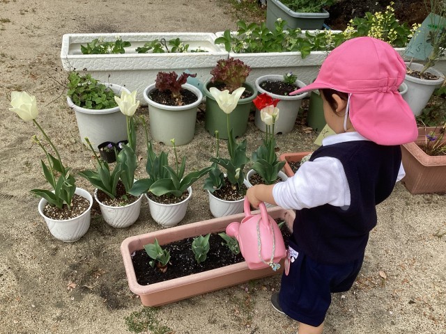 広い園庭に、色とりどりの花が咲いています。新入園児も進級児も、すぐに興味をもって、自分から水をあげに行ったり、散った花びらやチューリップの茎をご馳走づくりに使ったりして遊んでいました。外遊びがとても心地良い季節になりました。