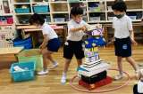 空き箱、ブロック、カプラ、空き缶、プラスチックの空き容器、何を積み上げるかは、チ...