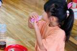 預かり保育では、おやつの時間があります。感染予防のため、隣との間隔をあけて静かに...