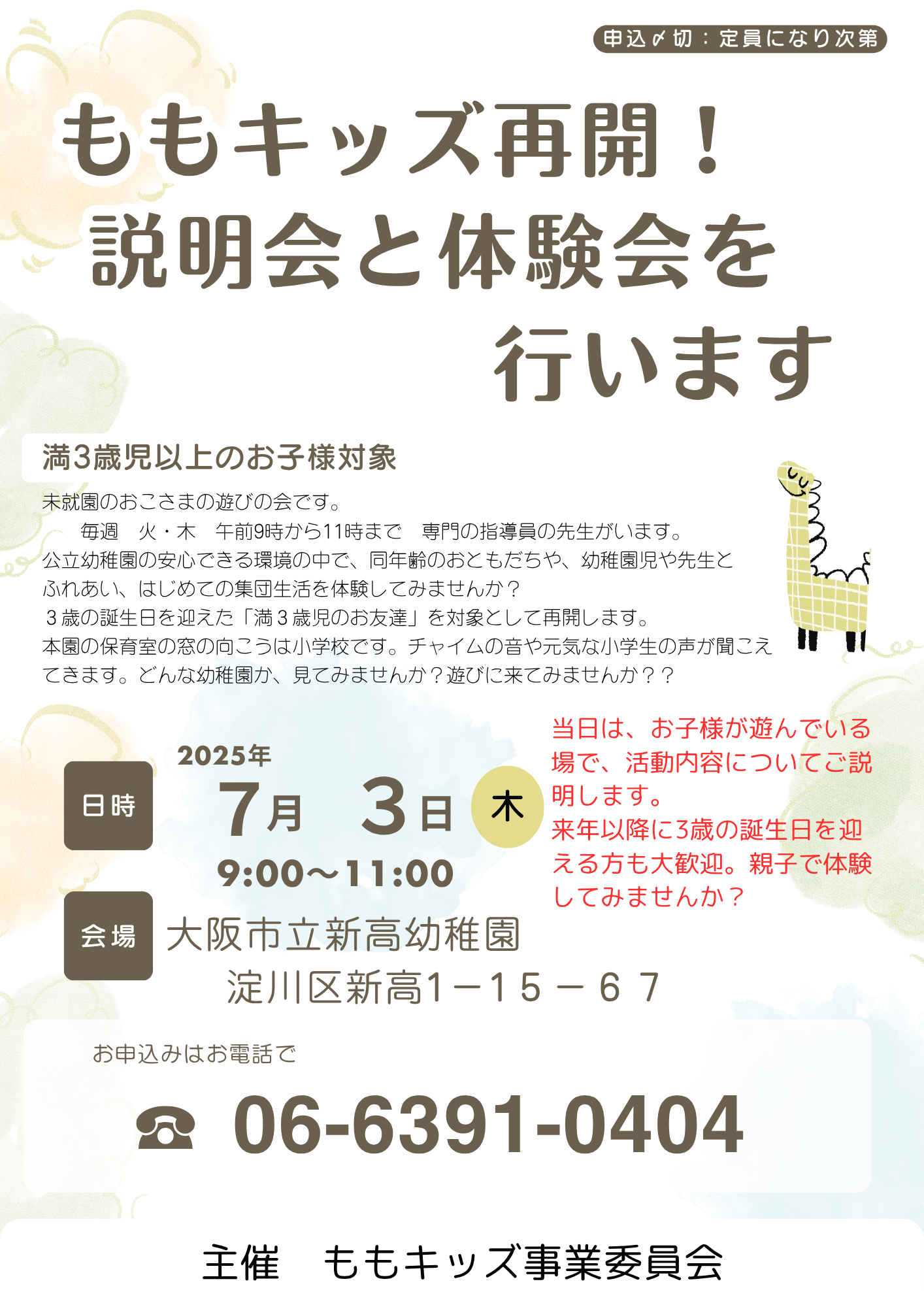 子育て支援 未就園児活動ももキッズが満3歳児の遊びの会として再開します。体験・説明会を実施しますので、是非遊びに来てください。