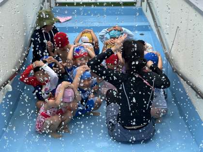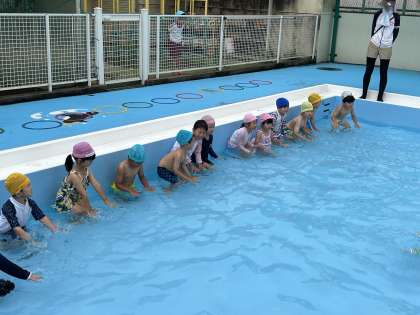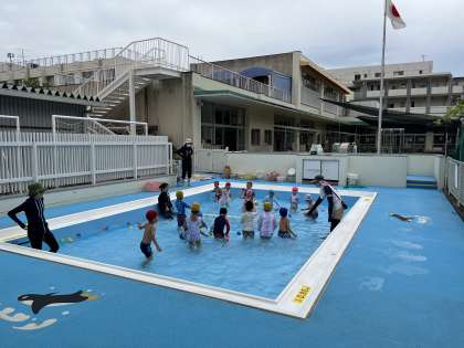 24日から始まったプール遊び。水の感触を味わい、体や顔が水に濡れる経験をするところからはじめます。楽しく遊びながら、水が鼻や口から入ると痛かったり怖かったりすることで、安全に気を付けることも知っていきます。今日は、水温が基準の温度まで上がらなかったのでプールはお休みし、園庭や砂場で水を流したり、泥んこ遊びをしたりしました。