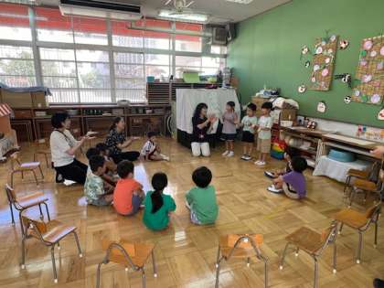 本園で長年にわたりお世話になっているゲストティーチャーを招き「えいごであそぼう」を催しました。先生がパンと手を叩く合図で、そこは英語だけの世界に!子どもたちは物おじすることなく、先生の言葉を見聞きしてすぐに先生の発音を真似ていました。