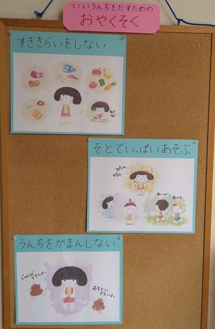 保健指導を行いました 公開日 2024/09/02 更新日 2024/09/02 できごと 発育測定の後、排便に関する保健指導を行いました。 紙芝居を使って、よいうんちを出すために大切な生活習慣や、硬さや形で体の健康状態が分かることなどを知らせました。 最後に、よいうんちを出すための3つの約束(好き嫌いをしないで何でも食べる、外でいっぱい遊ぶ、我慢しない)をしました。3つの約束はトイレの近くに掲示して、子どもたちに振り返ってもらえるようにしています。 いいね(0)