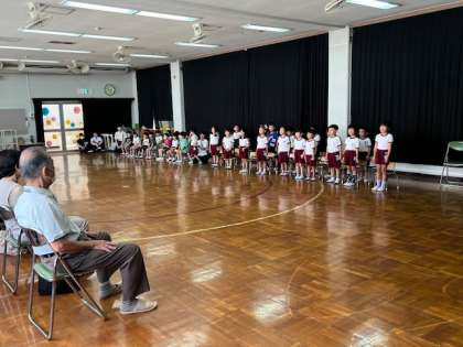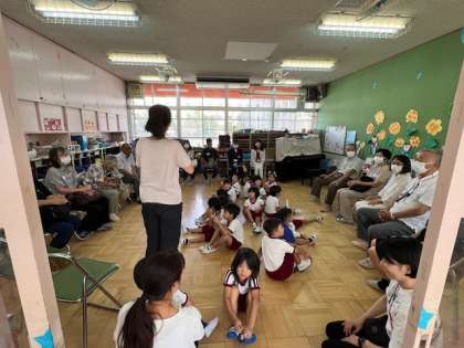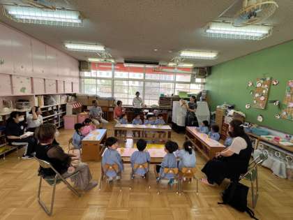 先日、祖父母の方々をお迎えして敬老の集いをしました。クラスでふれあい遊びをしたり、つくったり書いたりしているところを見てもらったりしました。リズム室では、歌や体操を披露してたくさん拍手をいただき、お礼に手作りのキーホルダーを贈りました。園児みんなを温かく見守っていただきうれしいひと時でした。