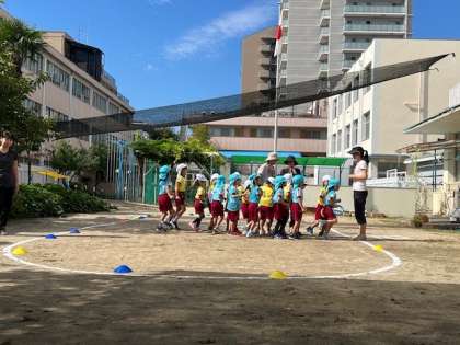 プログラム名の通り、青、白2つのチームが、一人ひとり自分の精いっぱいの力を発揮して走り、バトンをつなぎます。2学期、繰り返してリレーをして遊びました。その中で、連日、連続して同じチームが勝つことがありました。そんな中で、子どもたちも先生も接戦になるようにしたい、互いに競うことも楽しみたいという思いをもつようになりました。それからは、毎日「今日は〇〇ちゃんが休んでいるから誰が2回走る?」「〇〇ちゃんのバトン、しっかり受け取りにいくね」など、相談しながら走る順番を決めていました。追い抜かれたら気持ちが落ちてしまい、走るのをやめてしまう…そんな姿が多く見られた時期もありました。でも合言葉は「バトンをつないで」。競い合うというリレーの楽しさを味わいながらも、まずは、一人ひとりが全力で取り組む。最後まであきらめずバトンをつなぐ。その姿を大切にしています。ついつい応援に力が入ることと思います。一人ひとりに励まし、応援をお願いたします。