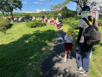 4歳児つき組が「秋さがし」に出かけました。まだまだ気温が高いので紅葉していませんが、色づき始めた葉っぱの他に少しですが、ドングリも見つけました。木陰を吹き抜ける風の気持ちよさは、秋の訪れを感じました。